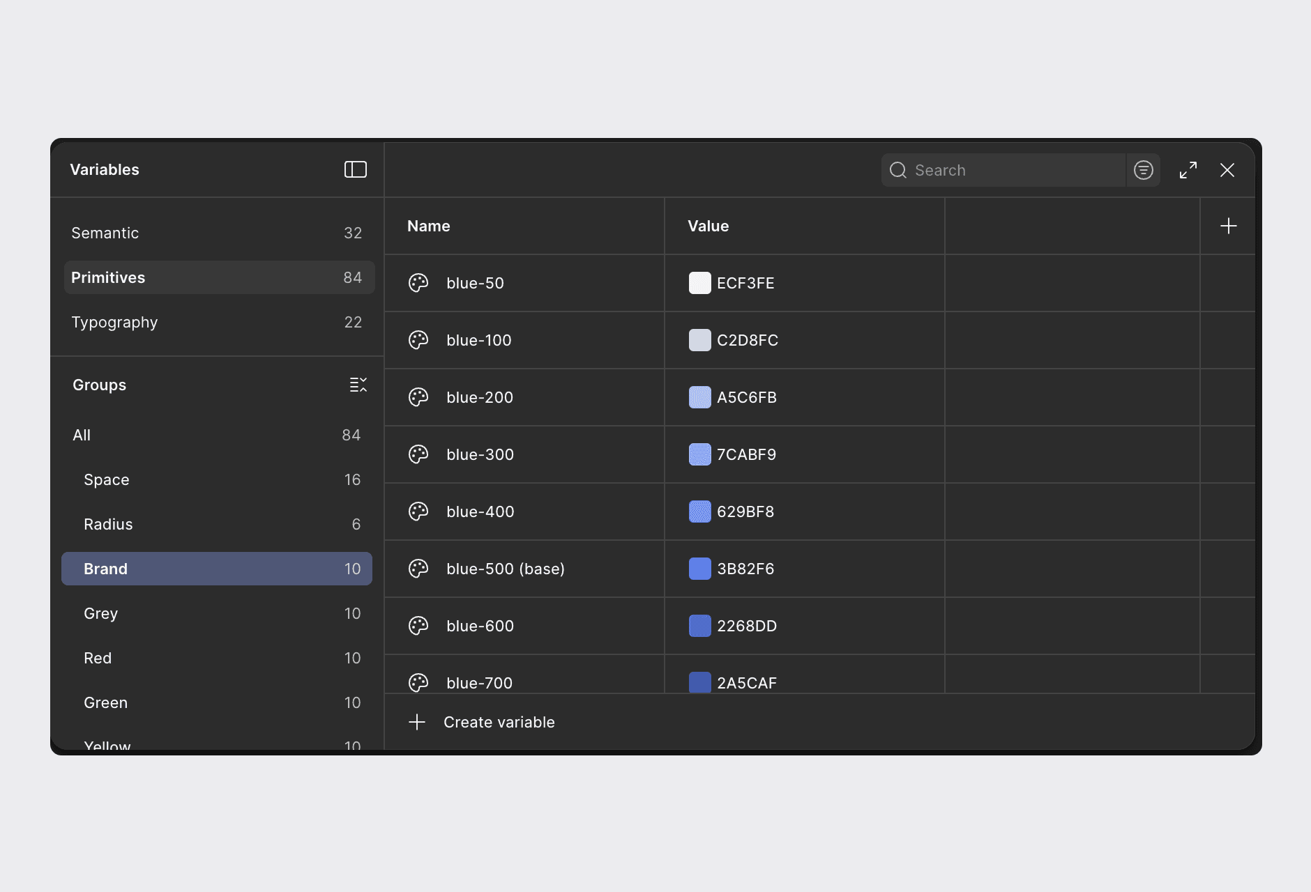 I created a set of core primitive variables, including colors, spacing, radius, and other foundational design tokens that serve as the base for the entire system.