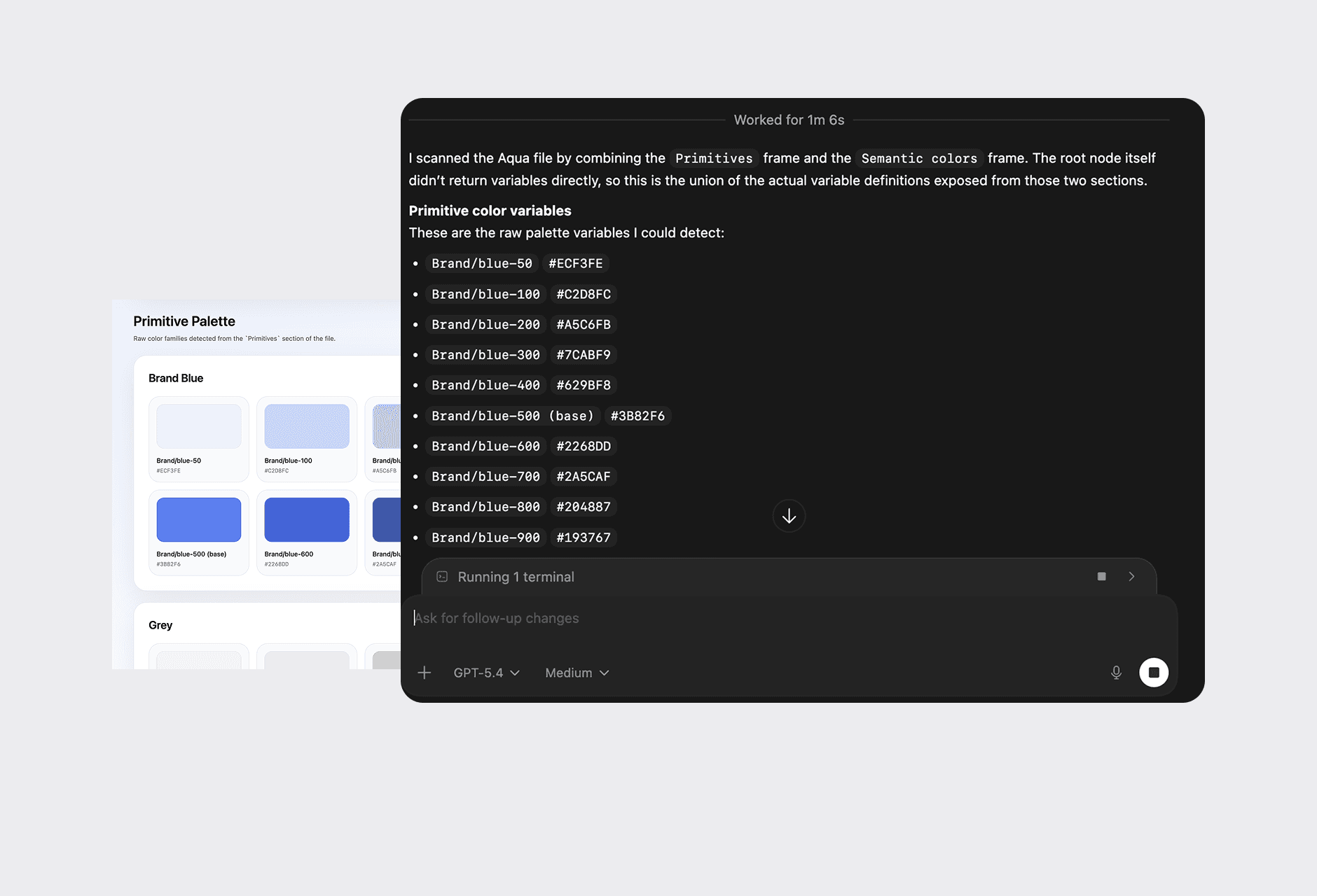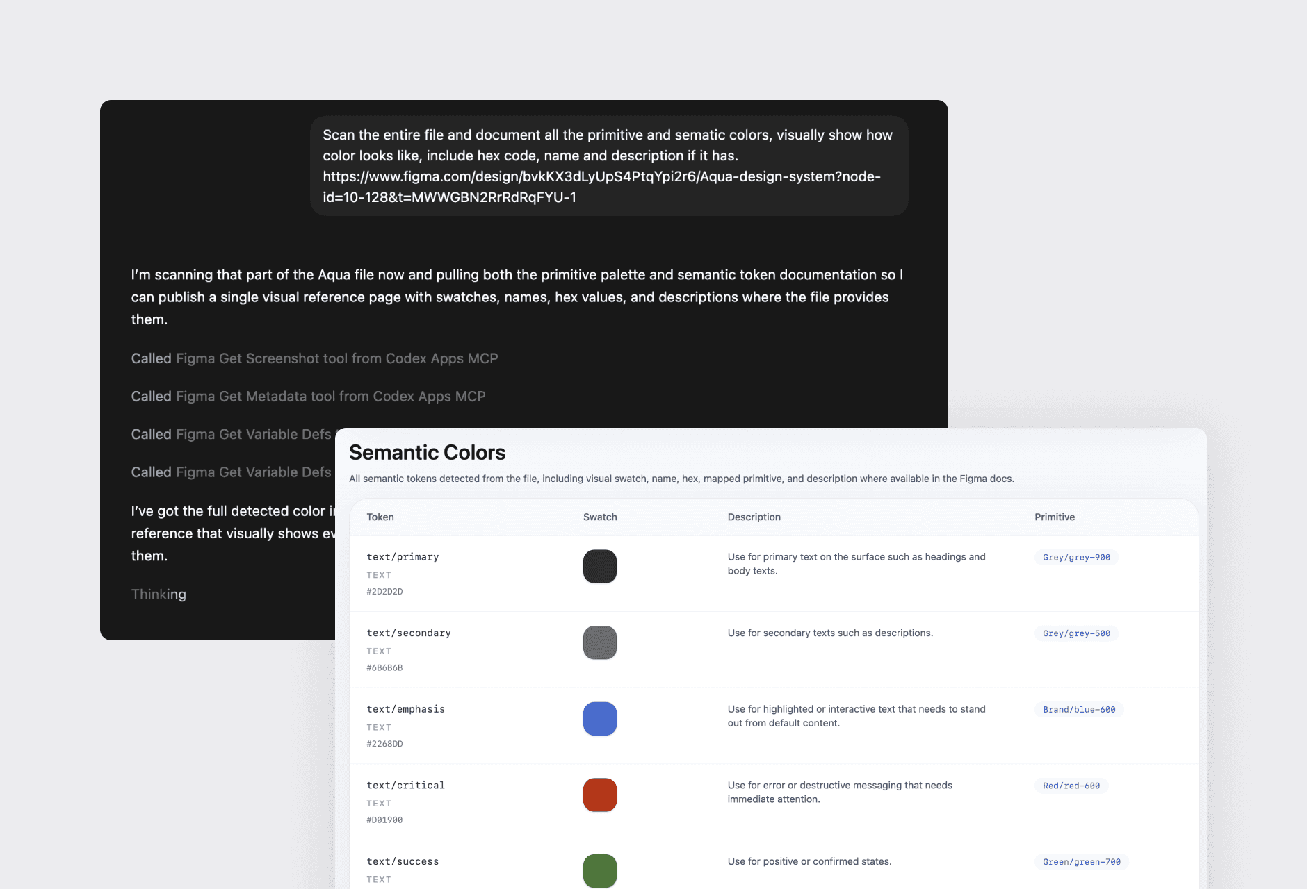 Used Codex to generate structured documentation for design tokens, including naming, hex values, and clear descriptions.